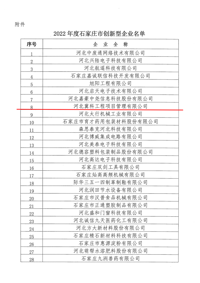 河北冀科工程項目管理有限公司通過石家莊市創新型企業認定