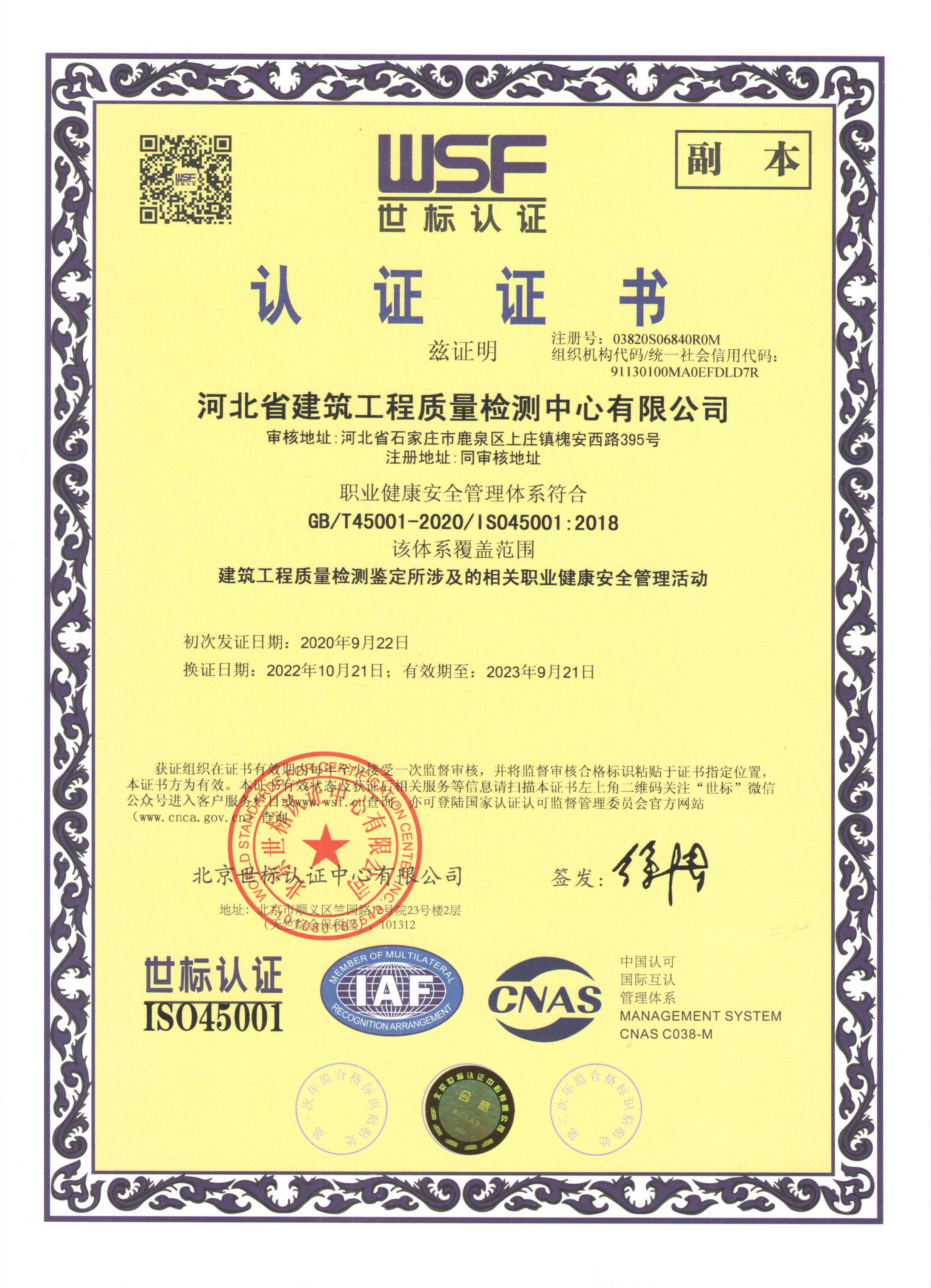 河北省建筑工程質量檢測中心特種設備檢驗檢測機構核準證
